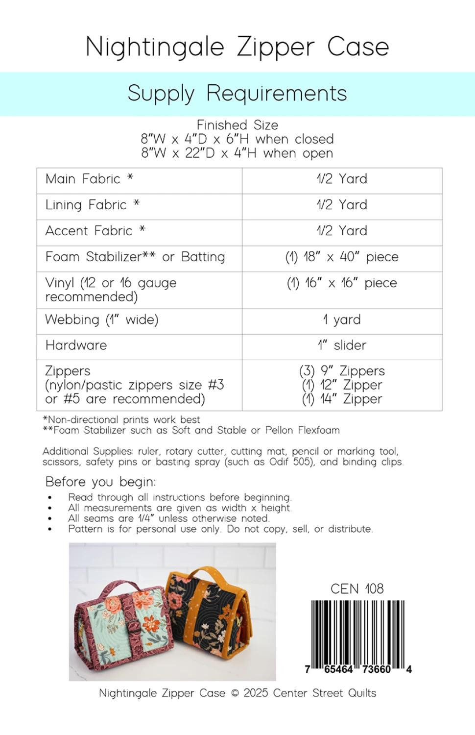 Nightingale Zipper Case mönster - Center Street Quilts